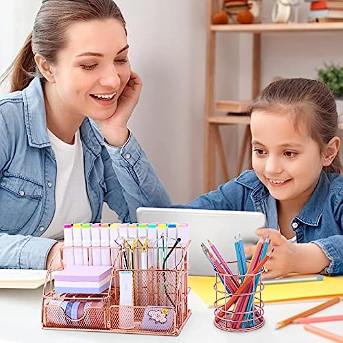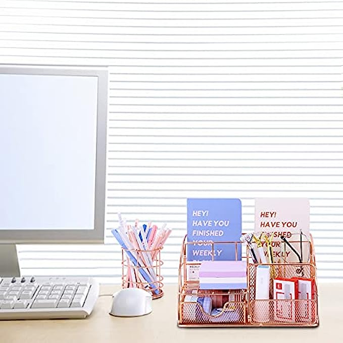 • FIT FOR YOUR DESK:Compact size and smart-looking make it fits your desk perfectly, allows you have enough space at your desk. Made of sturdy steel mesh with a solid base and beautiful rose gold finish, can be used for long time.