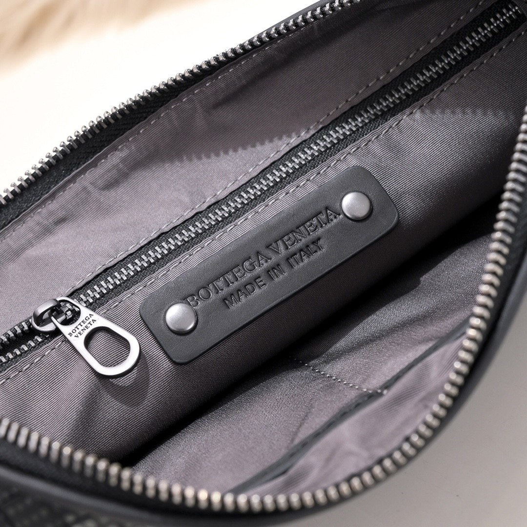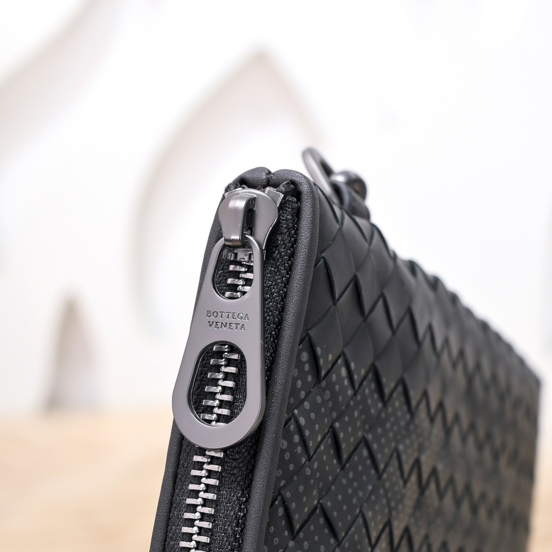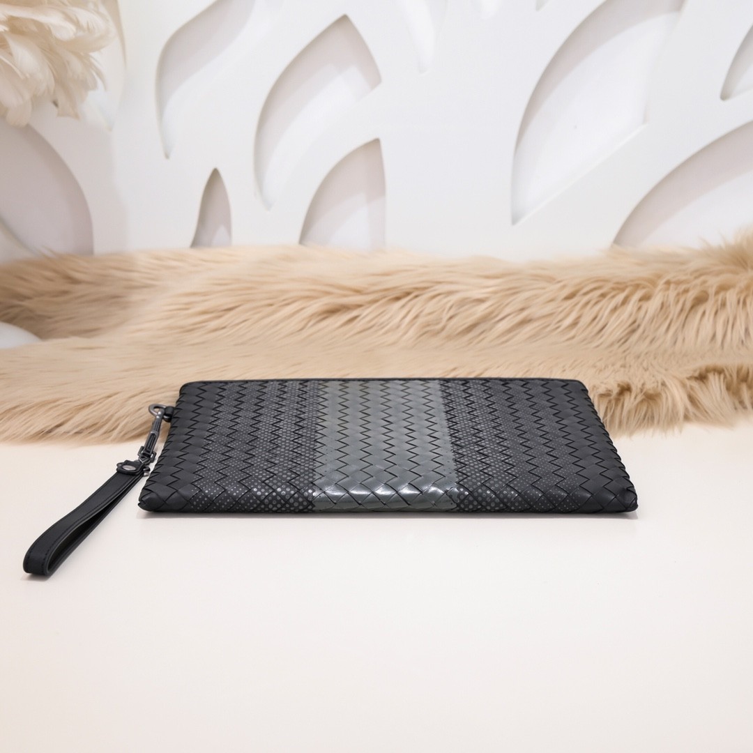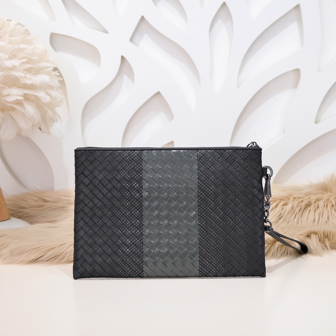 【BOTTEGA VENETA 寶緹嘉】Intrecciato 條紋拼接手拿包|黑灰編織 × 金屬拉鍊 × 精品質感