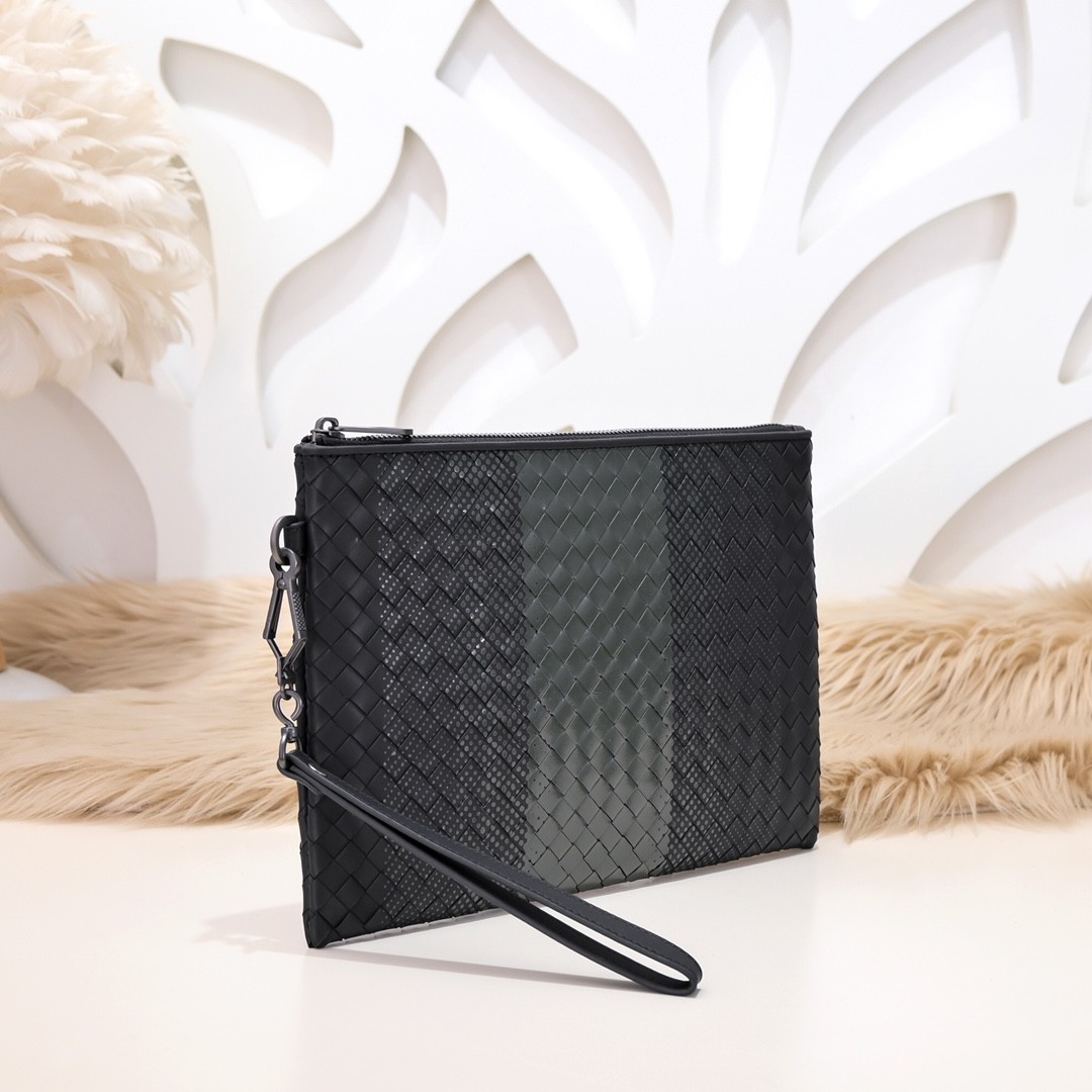【BOTTEGA VENETA 寶緹嘉】Intrecciato 拼色條紋手拿包|黑灰拼接 × 編織皮革 × 義式極簡風