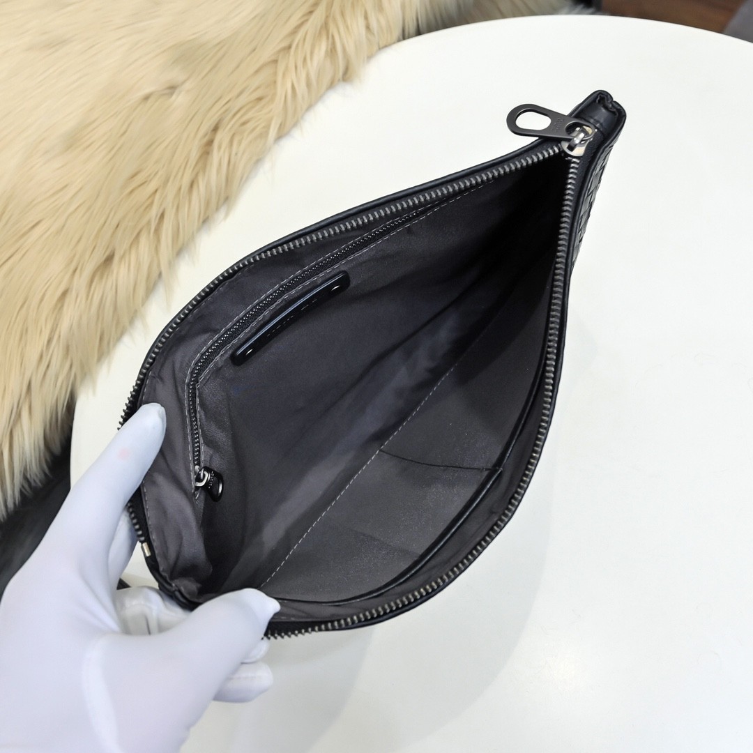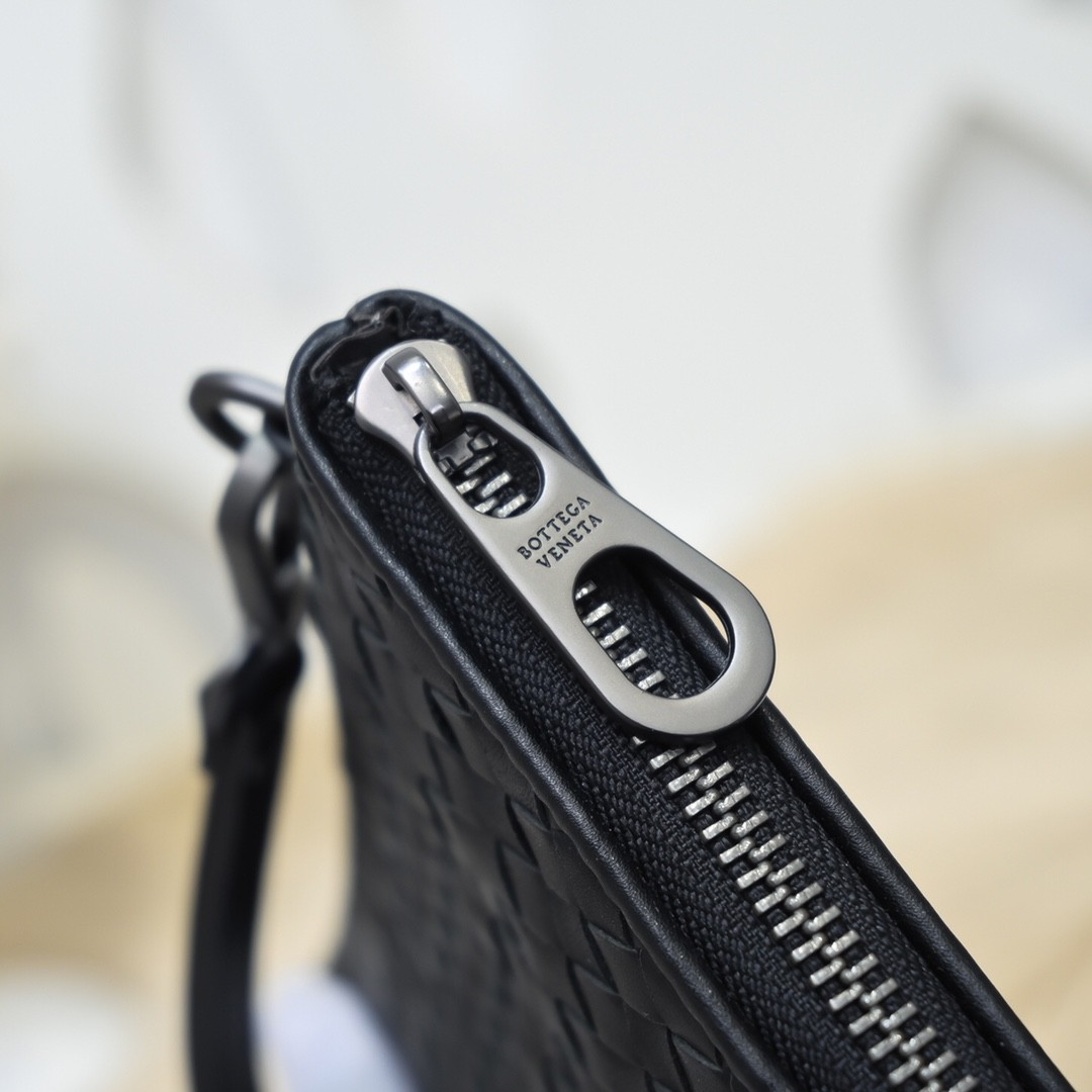 【BOTTEGA VENETA 寶緹嘉】Intrecciato 條紋拼接手拿包|黑灰編織 × 金屬拉鍊 × 精品質感