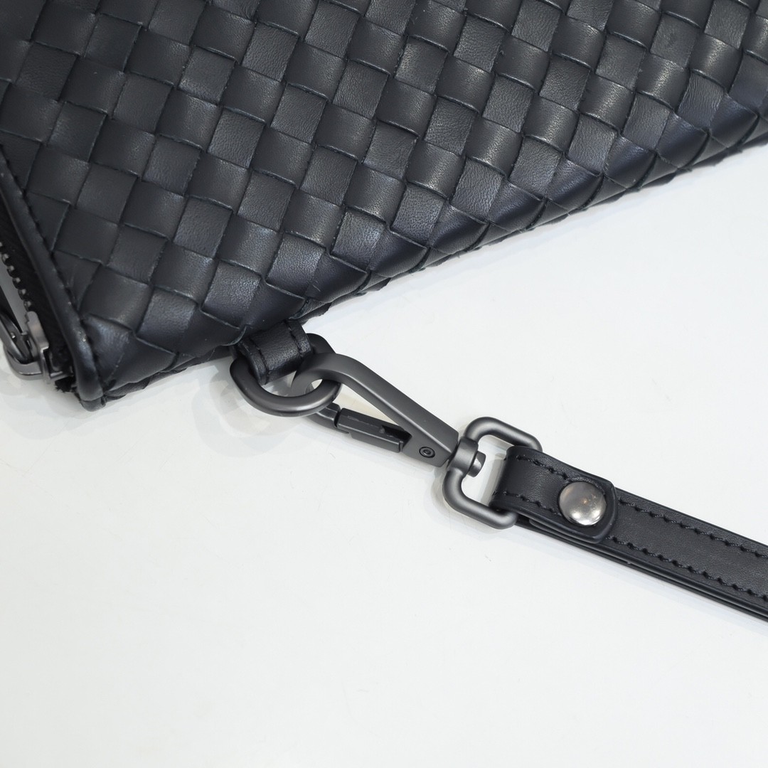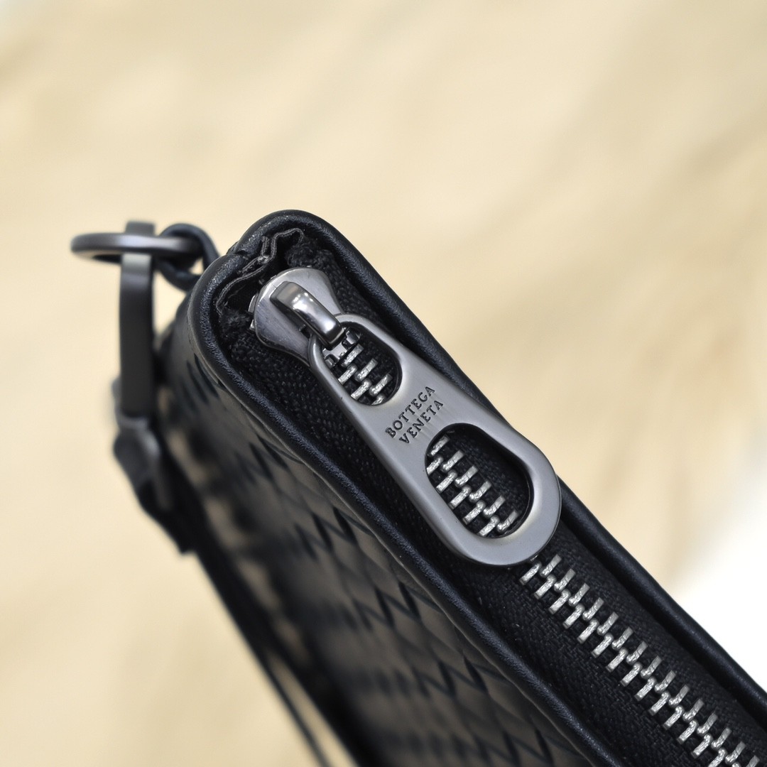 【BOTTEGA VENETA 寶緹嘉】Intrecciato 條紋拼接手拿包|黑灰編織 × 金屬拉鍊 × 精品質感