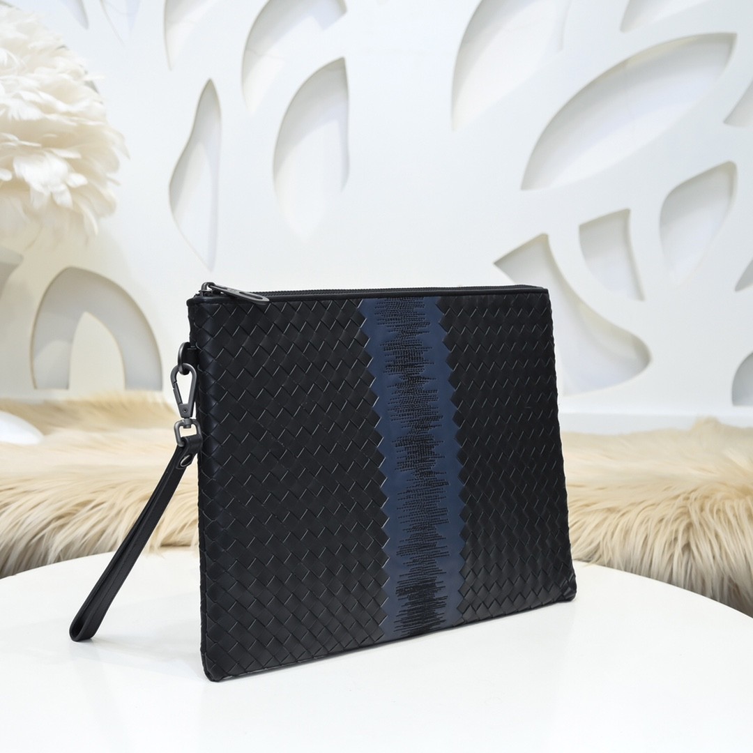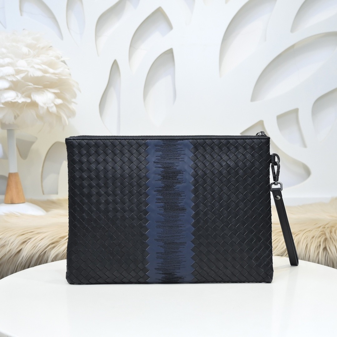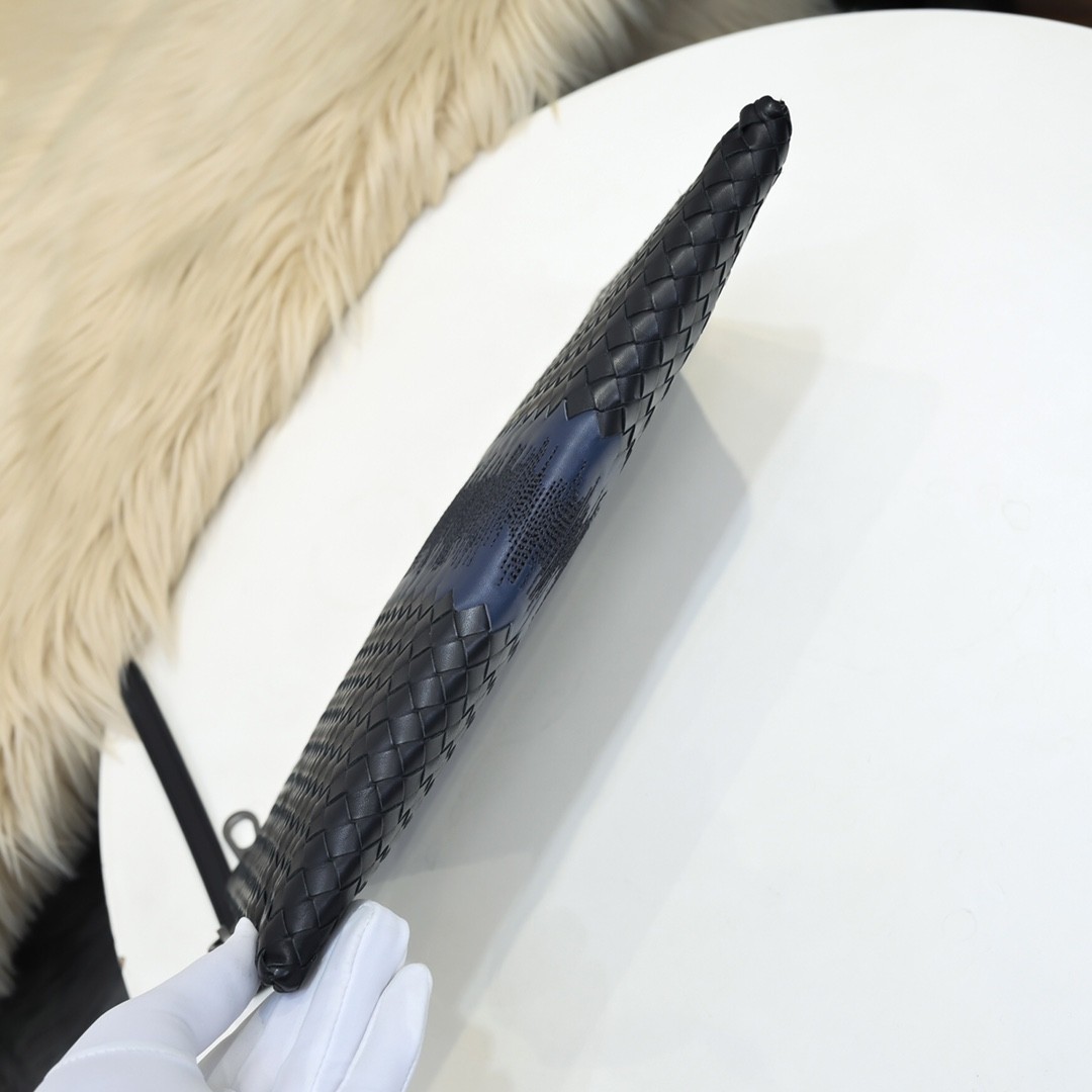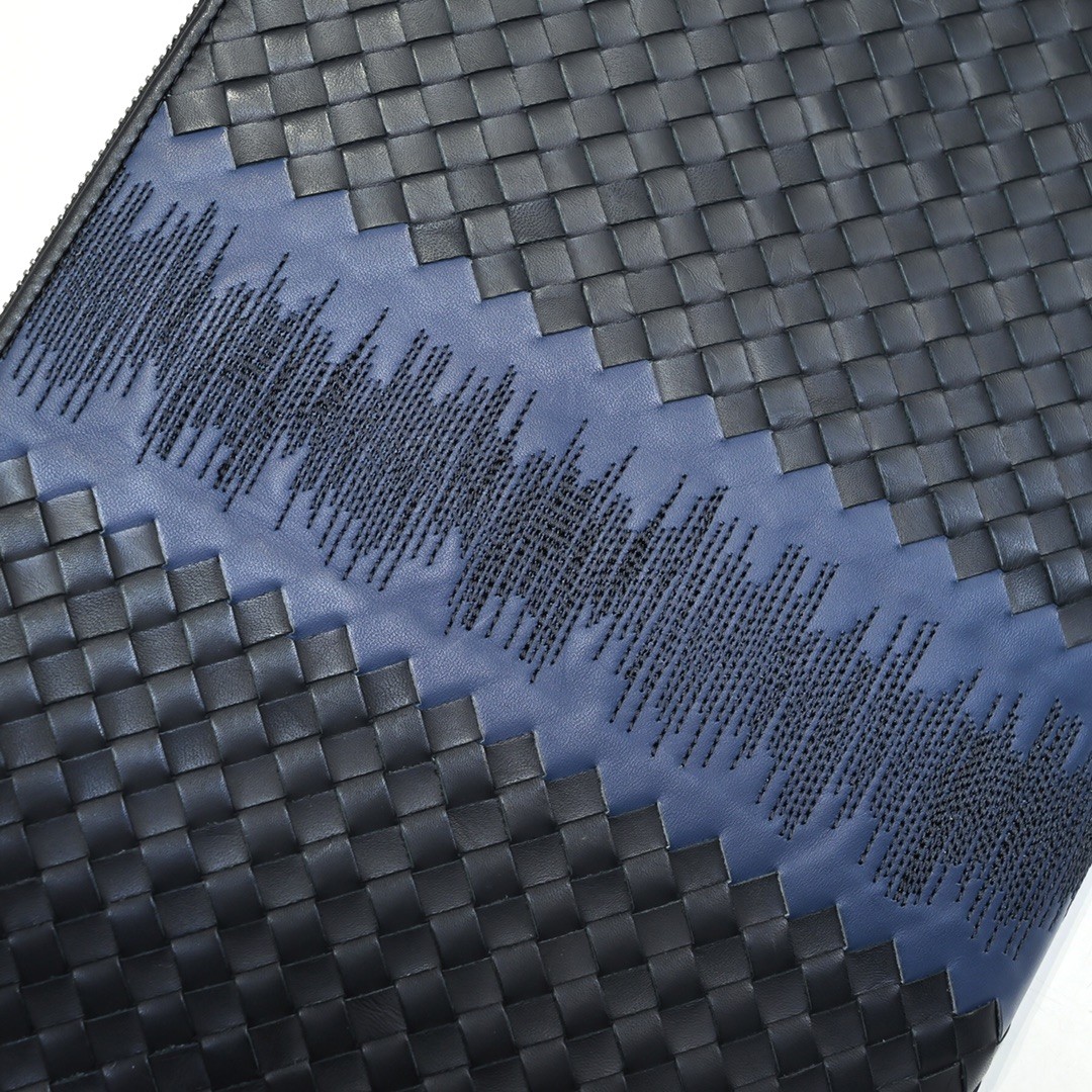【BOTTEGA VENETA 寶緹嘉】Intrecciato 音波藍黑手拿包|立體編織 × 聲紋中線 × 義式極簡工藝