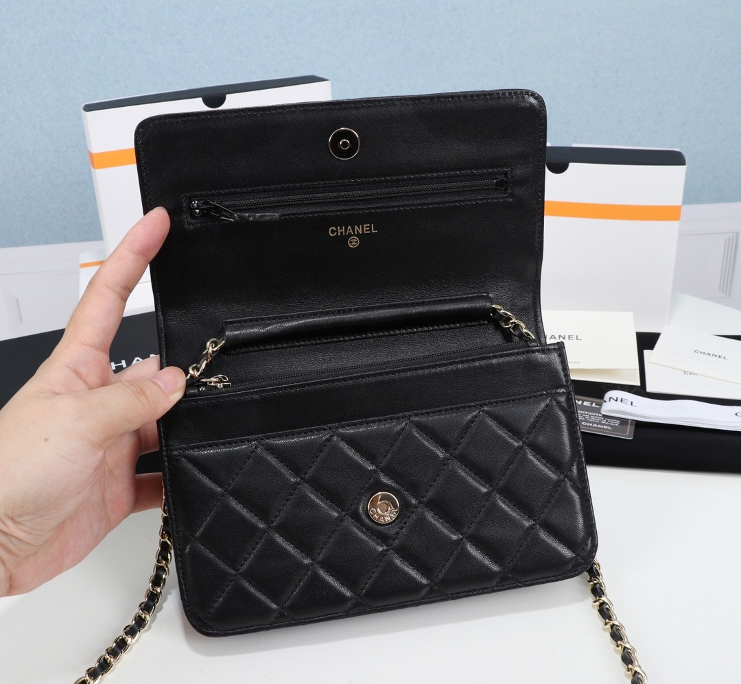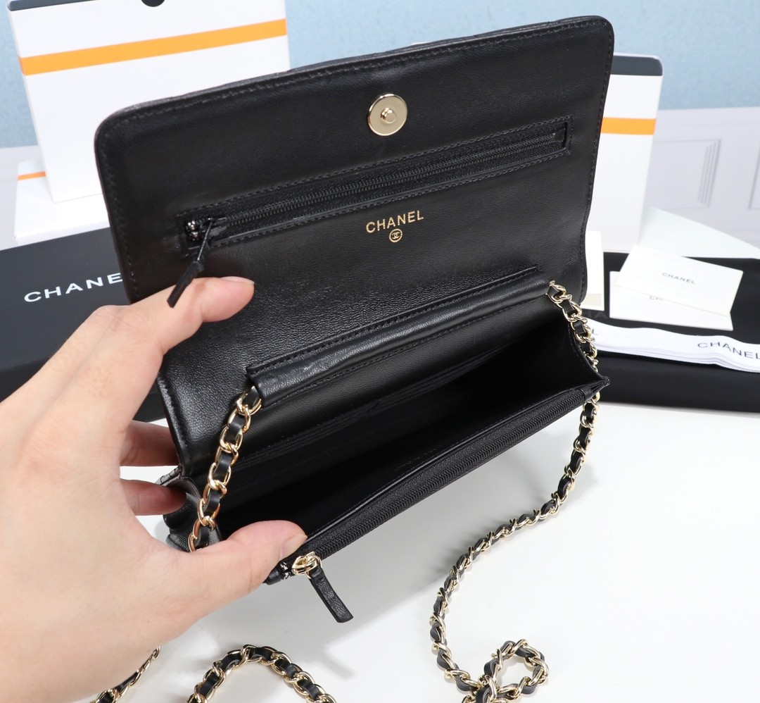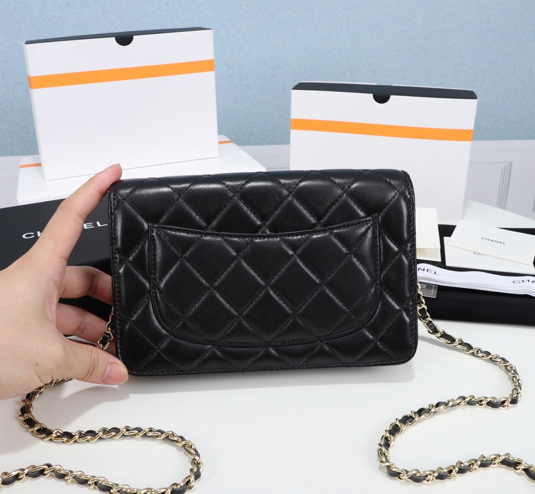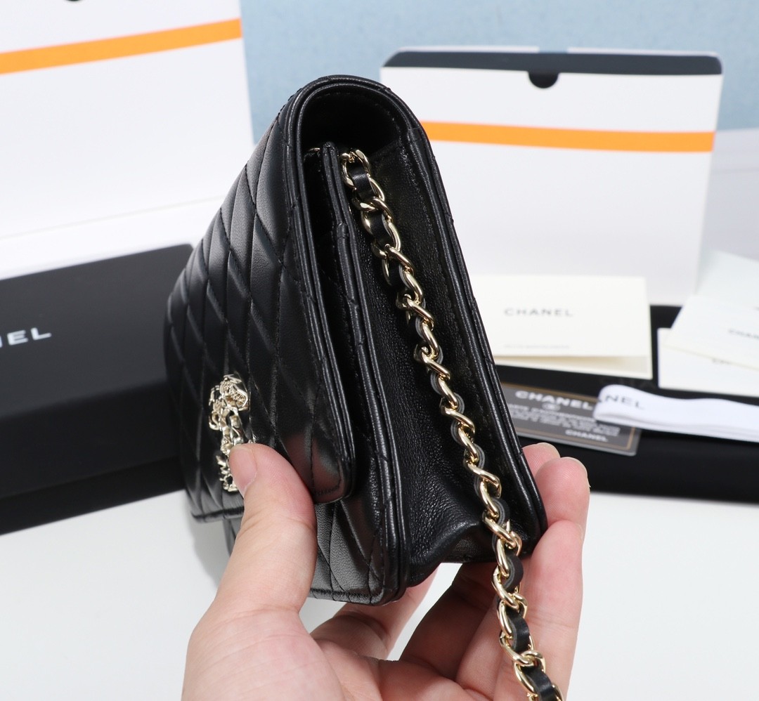 【CHANEL 香奈兒】經典菱格鏈條皮夾包 WOC|黑色羊皮 × 金鍊雙C標誌 × 優雅百搭小香風