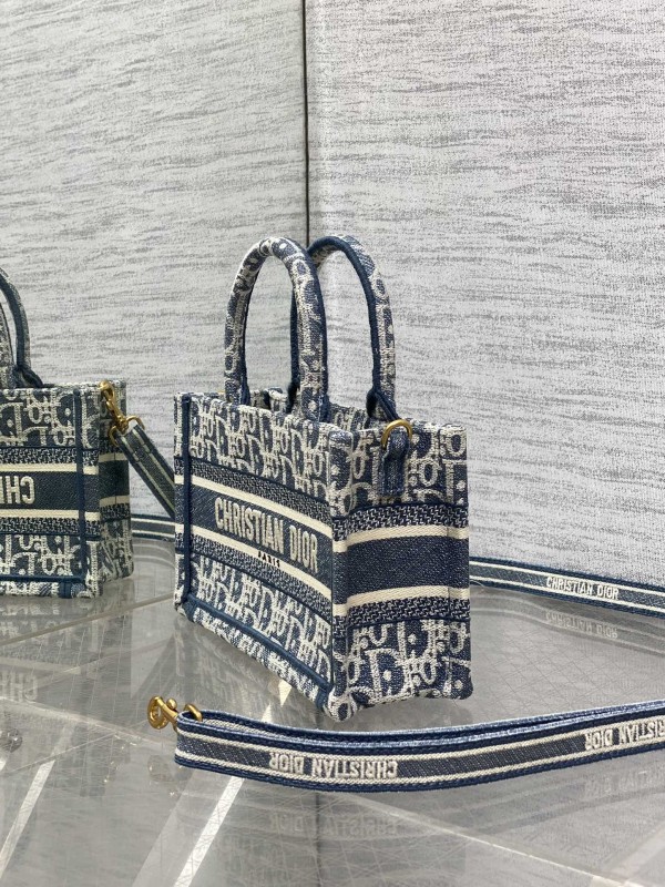【DIOR】Book Tote Mini 藍色 Oblique 手提包|經典刺繡帆布 × 精緻迷你版 × 附背帶可斜背