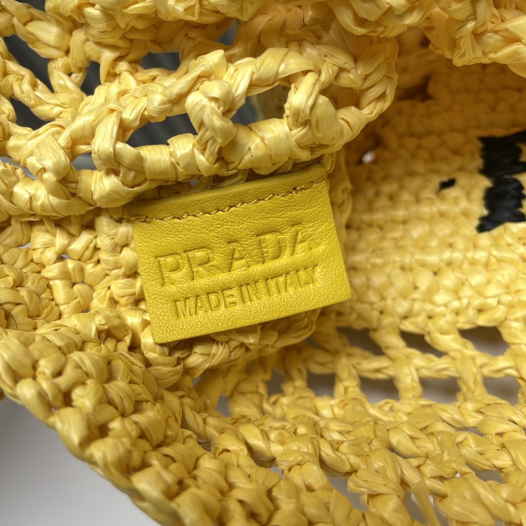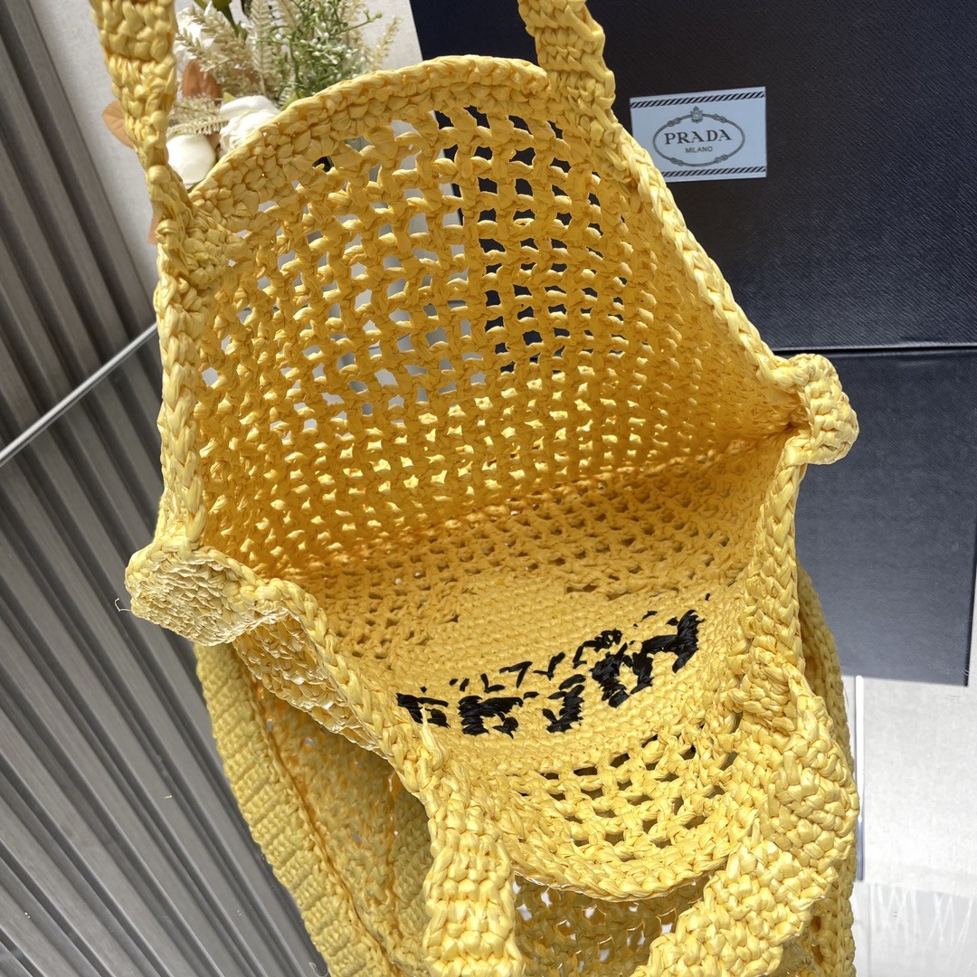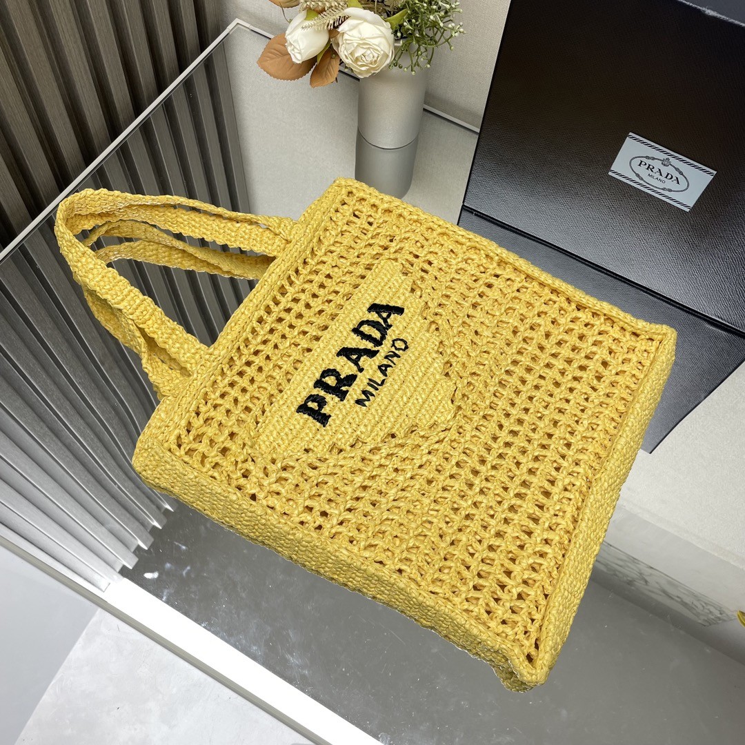 【PRADA 普拉達】Raffia 編織托特包|亮黃色 × 黑色Logo × 夏日陽光風