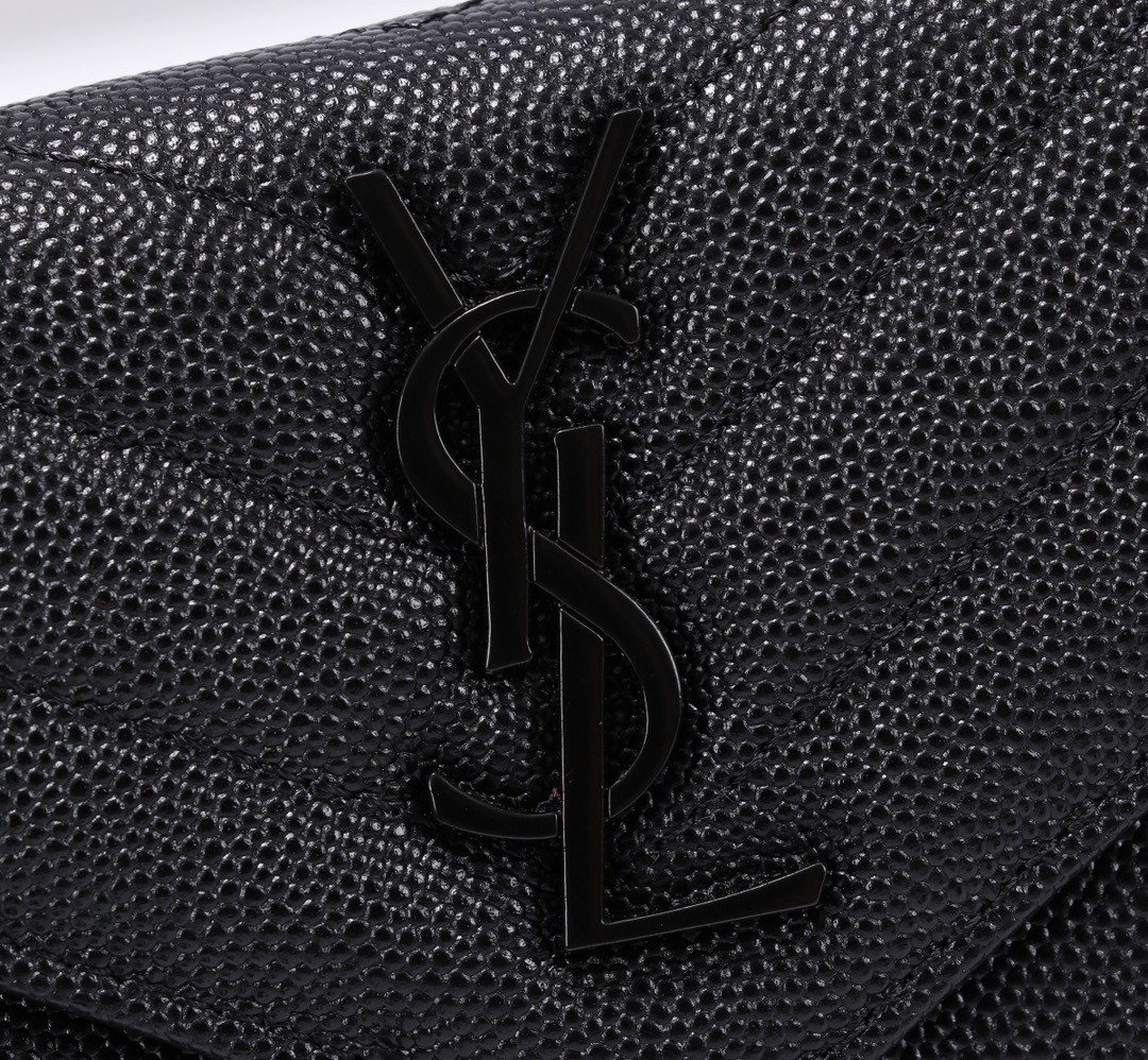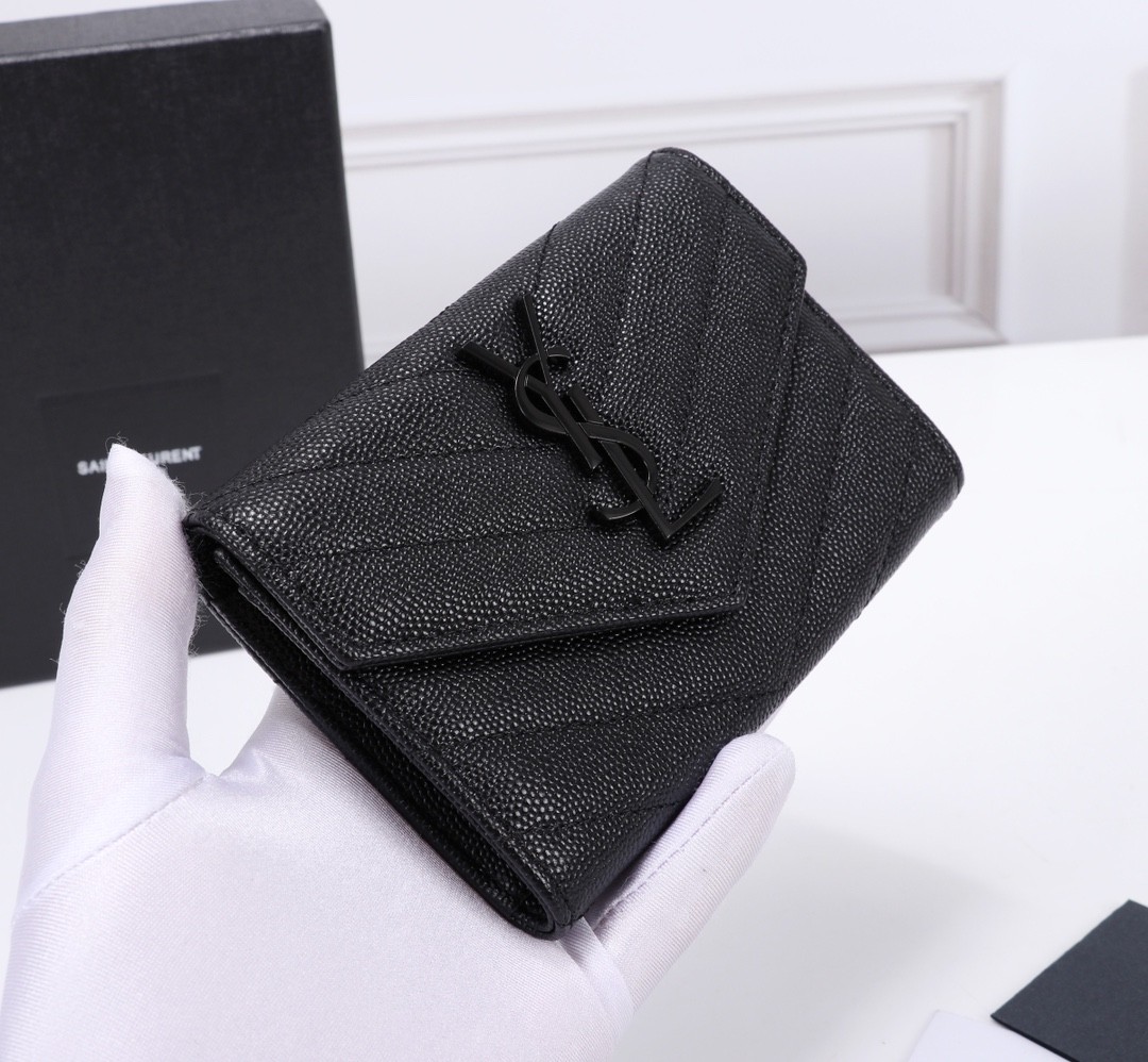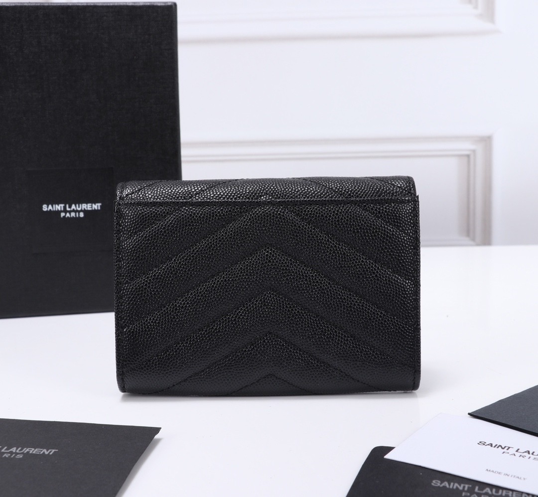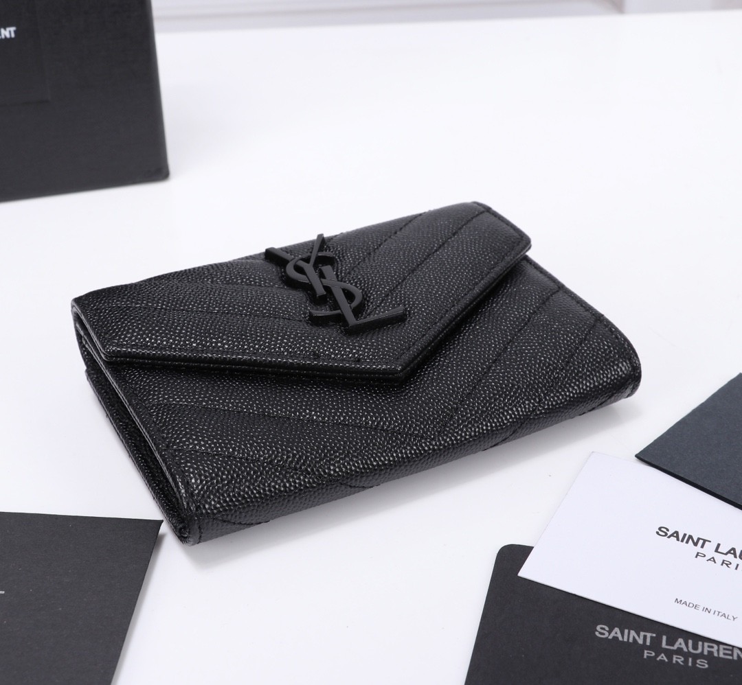【Saint Laurent 聖羅蘭】風琴式短夾(黑金款)|荔枝壓紋皮革、金色YSL字母Logo、多層收納設計