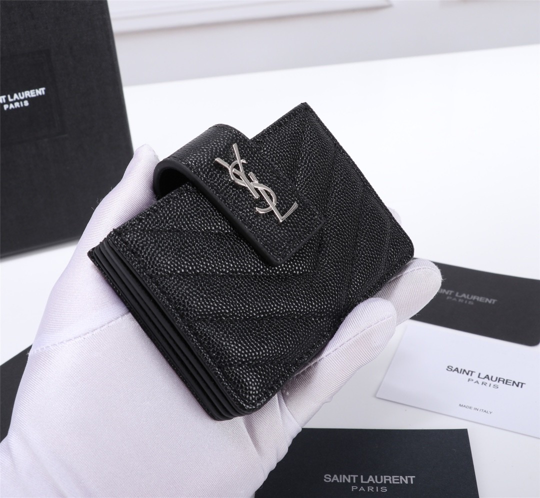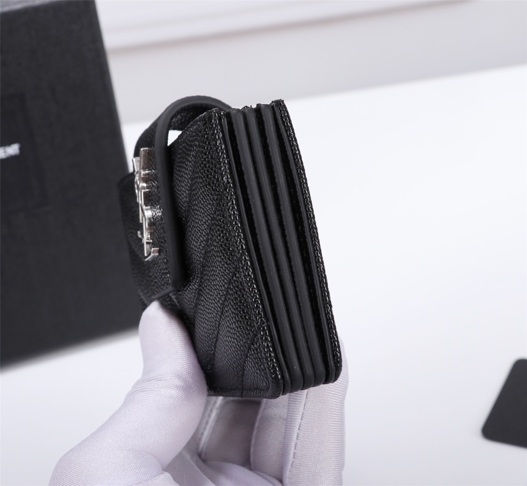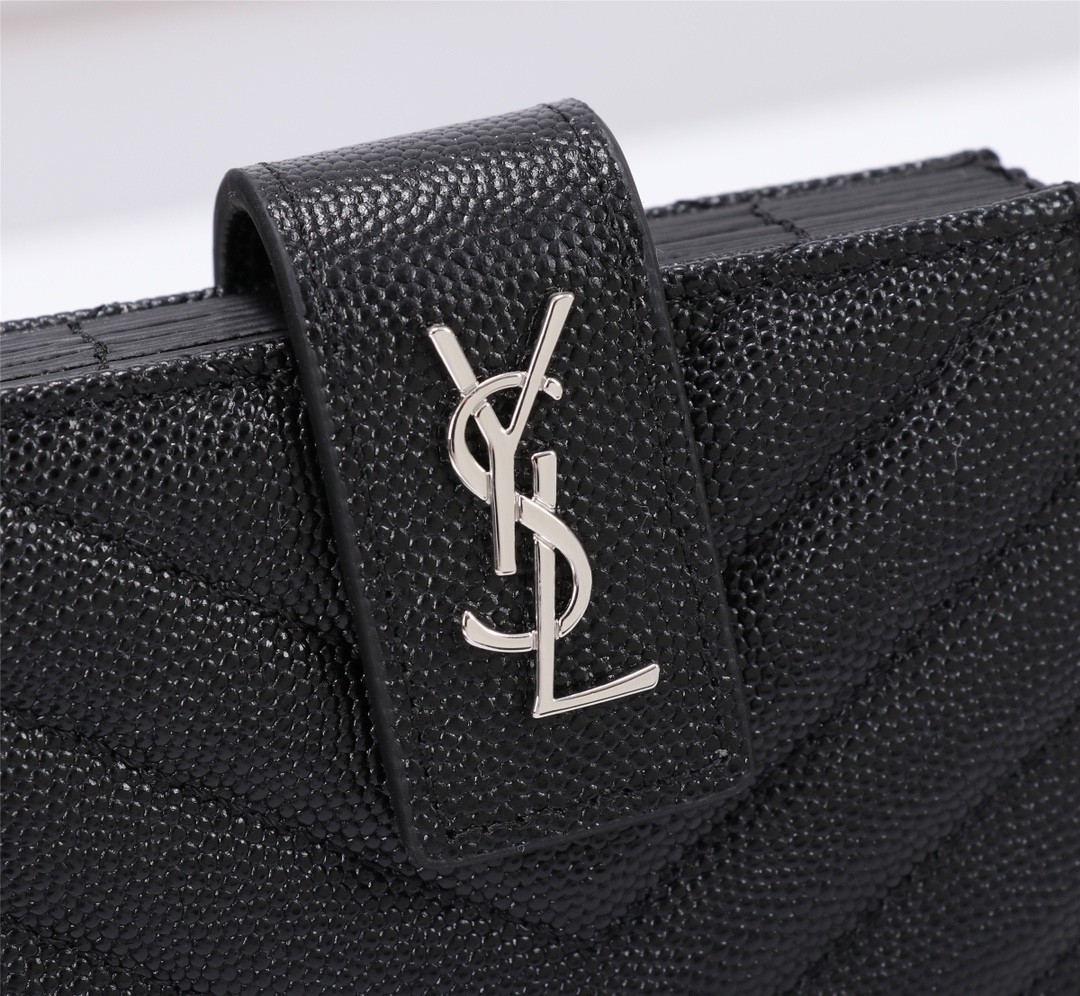 【Saint Laurent 聖羅蘭】風琴式短夾(黑銀款)|荔枝壓紋皮革、金色YSL字母Logo、多層收納設計