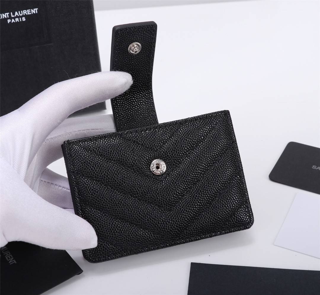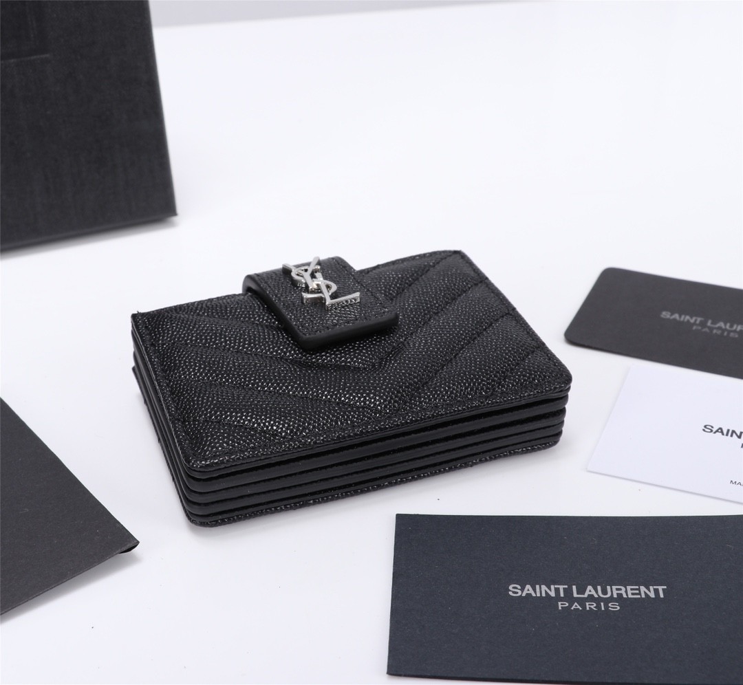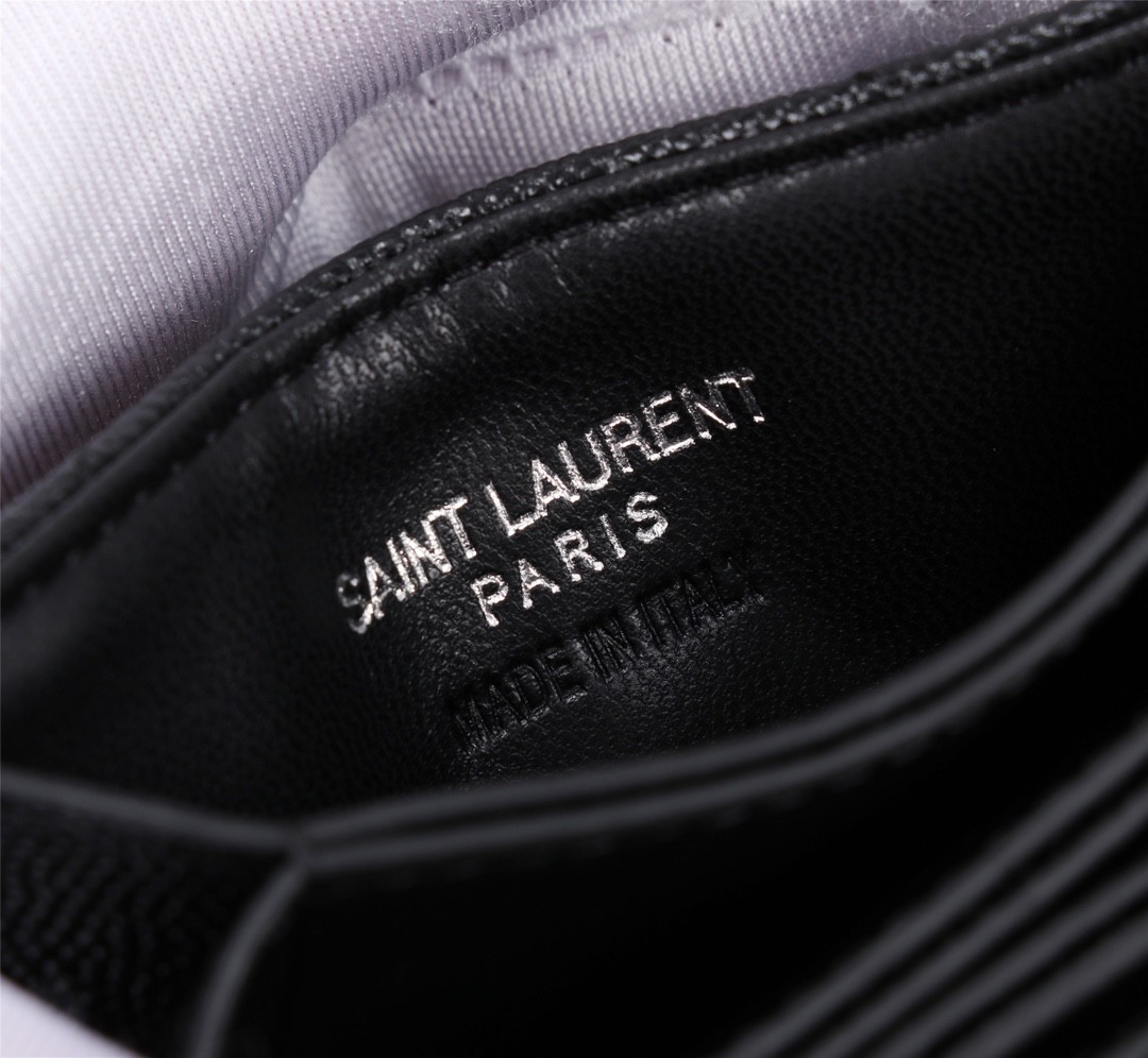 【Saint Laurent 聖羅蘭】風琴式短夾(黑銀款)|荔枝壓紋皮革、金色YSL字母Logo、多層收納設計