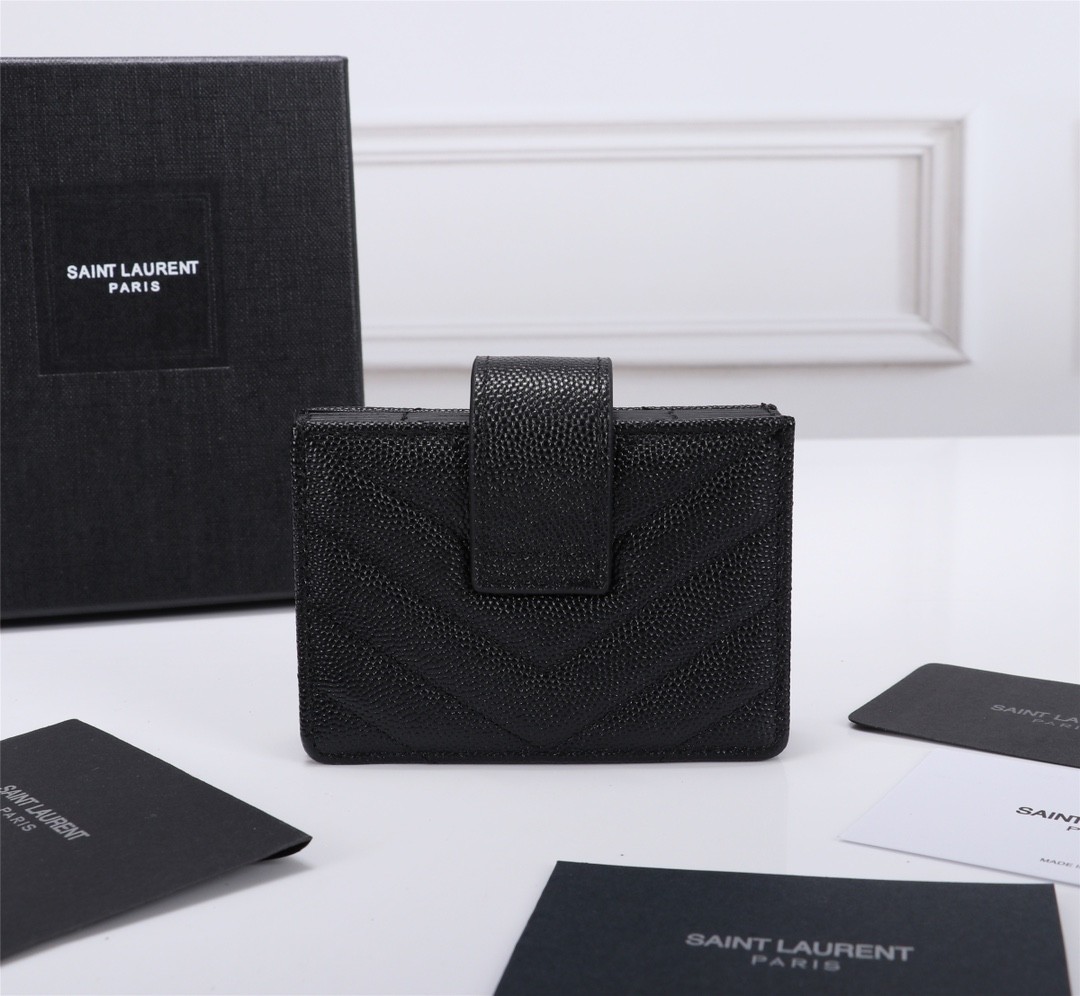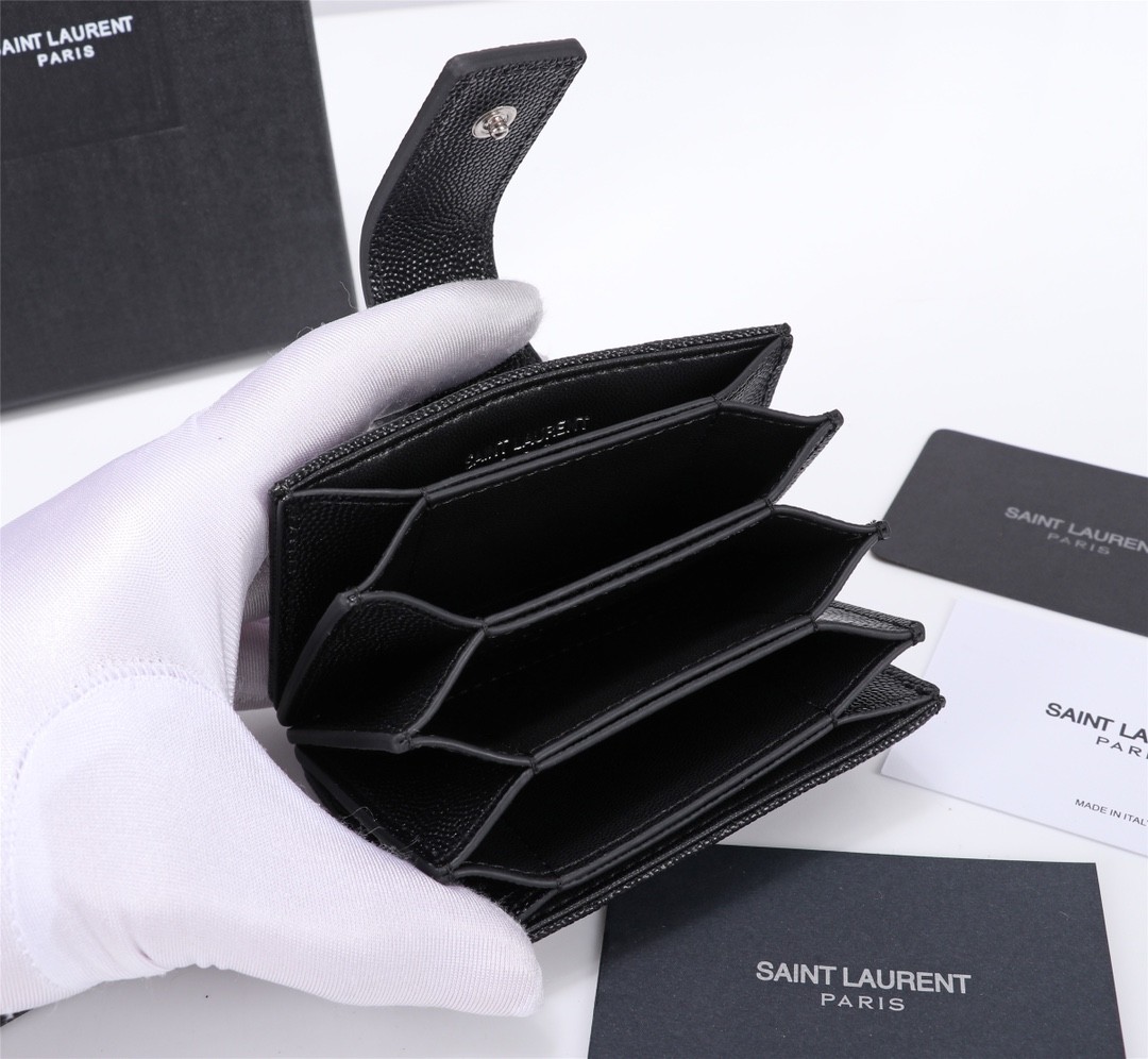 【Saint Laurent 聖羅蘭】風琴式短夾(純黑款)|荔枝壓紋皮革、金色YSL字母Logo、多層收納設計